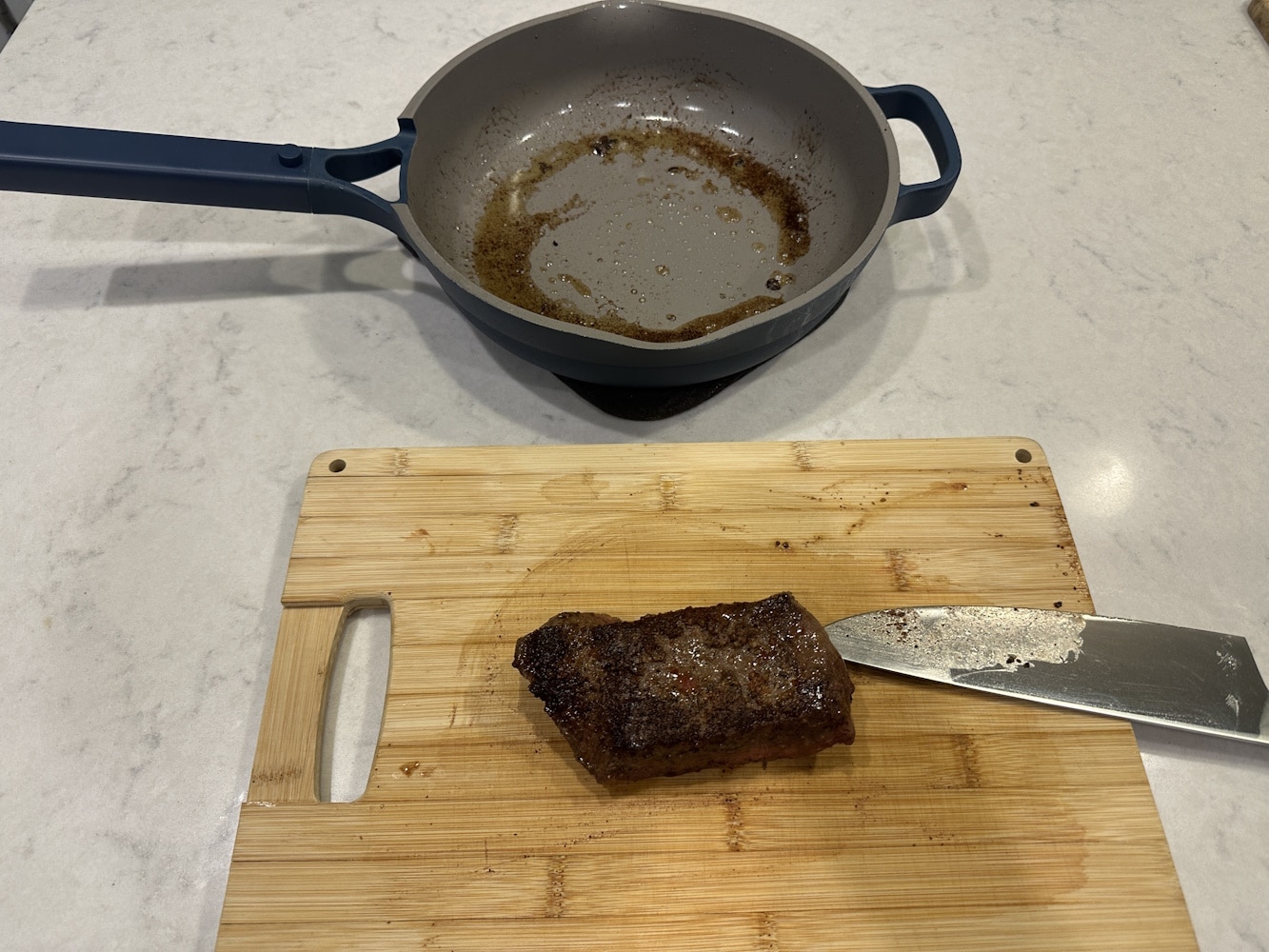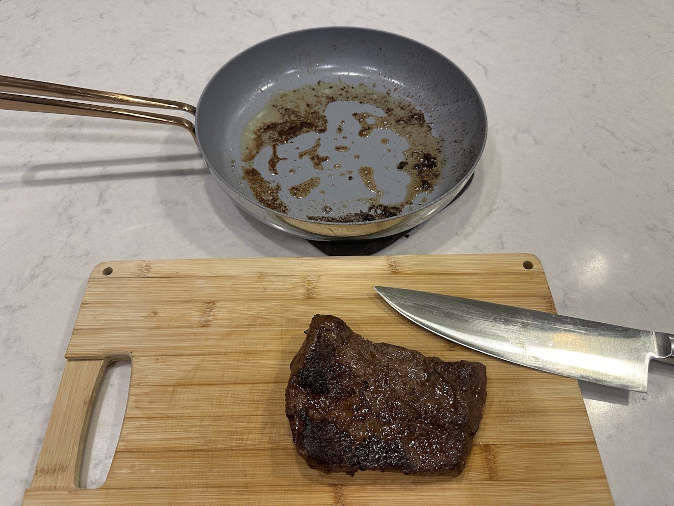 The Steak Test: Typically I haven’t been a fan of steaks cooked on a nonstick, but this cut got cooked evenly with nice, slightly burnt edges.
