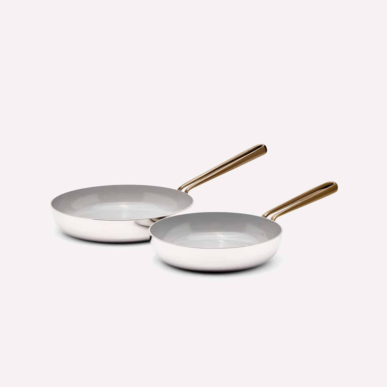 Great Jones makes, in my opinion, some of the most attractive cookware available. The Fry Family pans come in a bright, clean white (called “Salt”) and have contrasting welded handles.