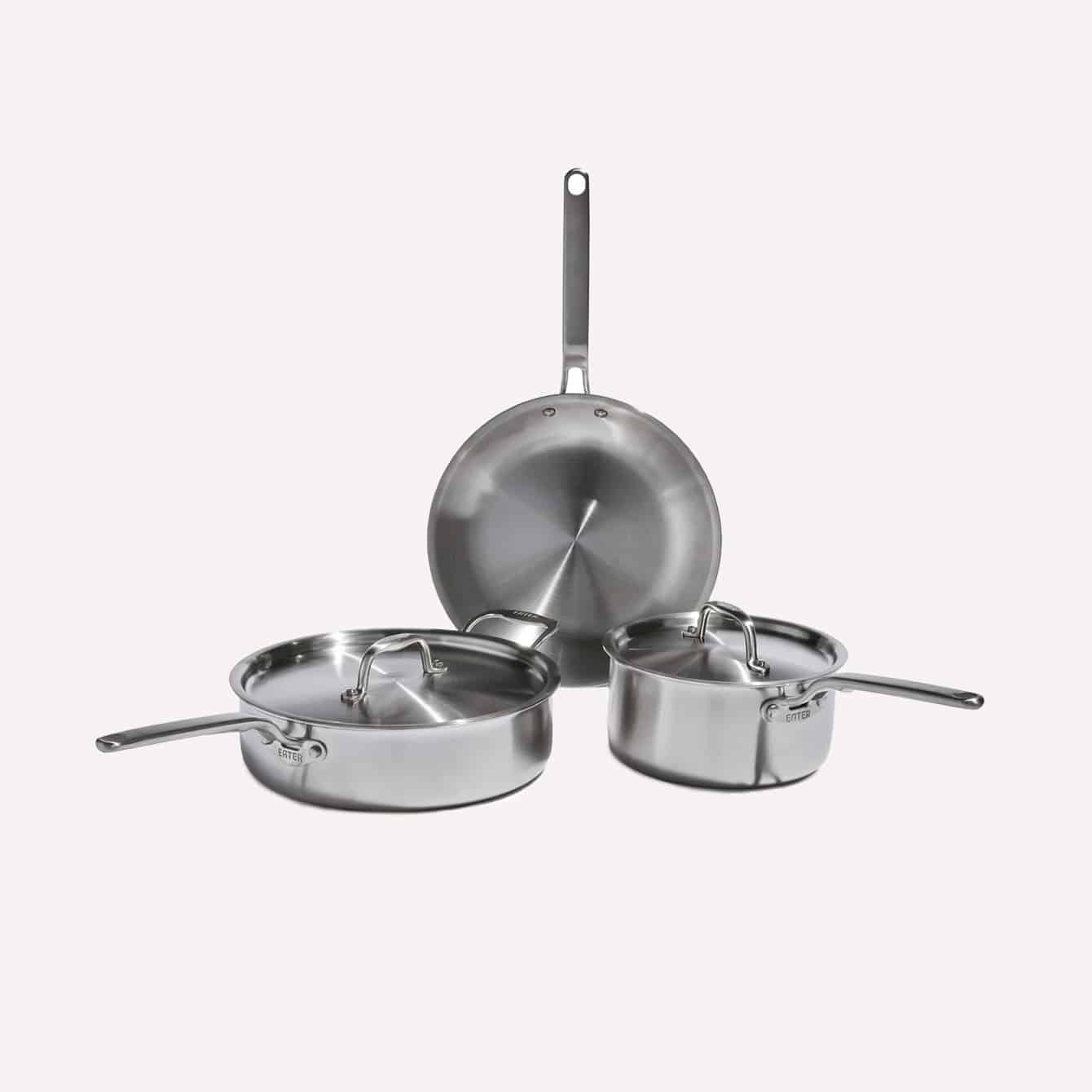If you’re looking for quality essentials and nothing else, this Eater x Heritage Steel set is perfect for small spaces. It comes with a 10.5” fry pan, saucepan with lid, and sauté pan with lid. There’s basically everything you need cookware-wise if you’re living by yourself.