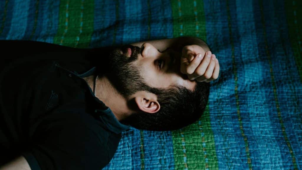 Overhead view of a man and woman lying back-to-back in a white bed.