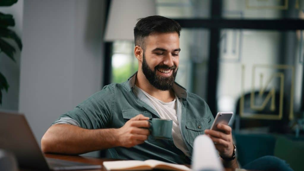 A bearded man with glasses and a blue sweater smiles while looking at his smartphone, holding a white coffee mug in his other hand at a desk.