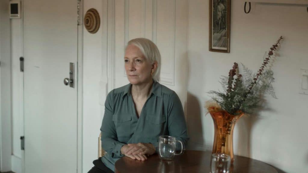 An older woman sitting on the floor beside a chair, holding her glasses thoughtfully.